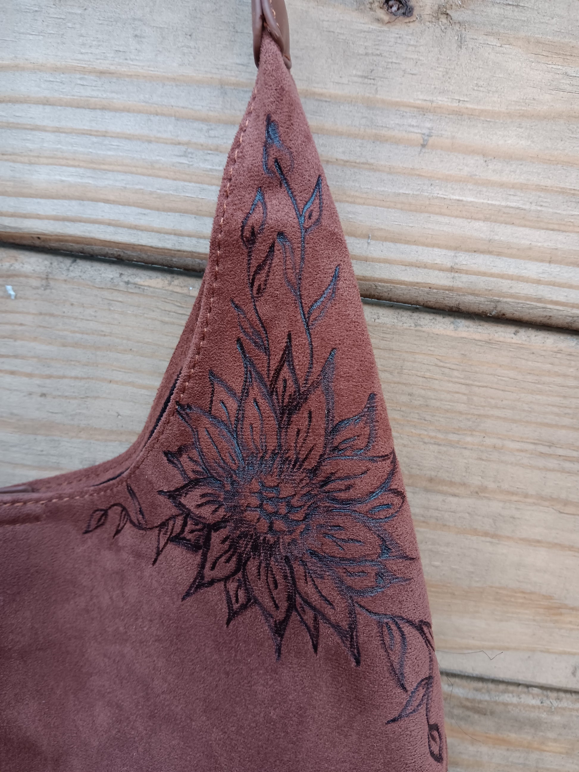 Hand-burned Brown Sunflower tote bag with magnetic closure